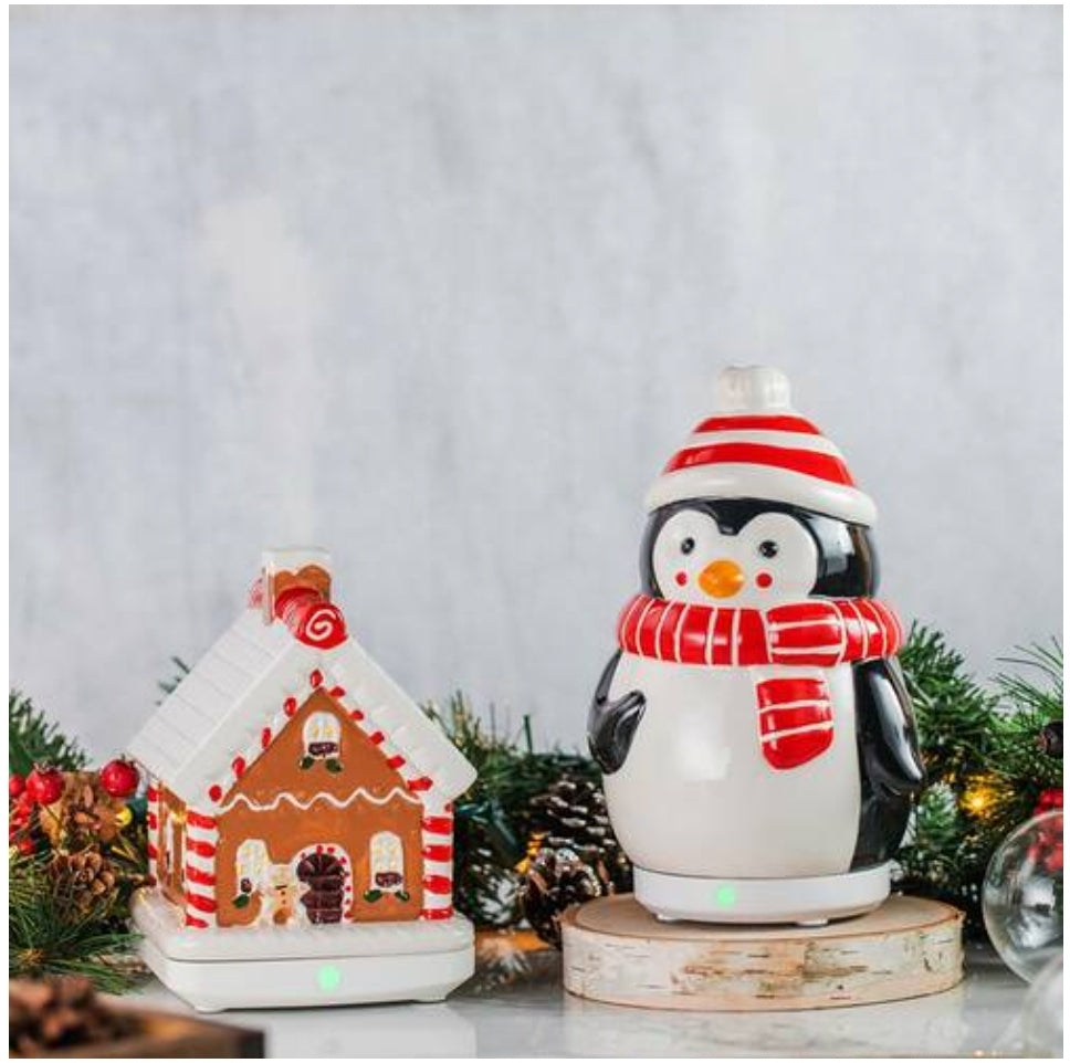 Pennie the Penguin Ultrasonic/ winter Wonderland Christmas Cottage Essential Oil Diffuser is sure to delight your senses this holiday season and for years to come! This adorable ceramic diffuser has up to a 10 hour run time intermittently and 5 hours continuous. Add 5 drops of pure essential oils for healthful benefits!